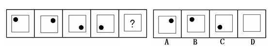 (答案:B。黑点在正方形中顺时针移动。在第5个图形中,应该正好移动到左上角。)
