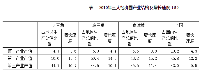 三大经济圈中,2010年三次产业增长速度均超过全国平均水平的有几个?