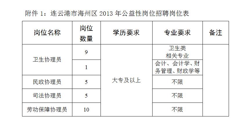 本岗位为政府开发的基层公益性岗位,专职从事基层公共卫生协理、民政协理、劳动保障协理、司法协理等工作。本次海州区计划招聘30名,被录取人员具体岗位由区人力资源和社会保障部门、卫生部门、民政部门、司法部门统一分配(招聘岗位及数量详见附表1)。市区范围内经本人同意可以在某区录取不足时从其他区参加考试人员中调剂录取。
