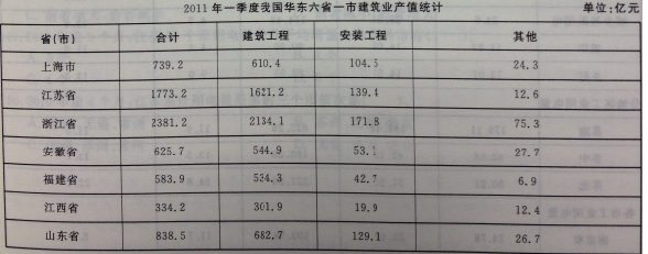 2011年一季度我国建筑业产值为16096.4亿元。其中,建筑工程产值14220.0亿元,安装工程产值1405.2亿元,其他471.2亿元。华东六省一市相关数据见下表。