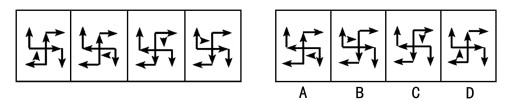 【解析】A。第一行三个图形的时针方向是“顺、逆、顺”,第二行的时针方向是“逆、顺、逆”、第三行的时针方向是“顺、逆、?”,因此,答案选择一个逆时针旋转的图形,选择A选项。