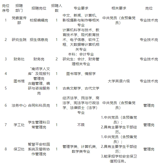 根据南京师范大学2025年进人计划,现面向社会公开招聘非教学单位工作人员9名,招聘具体事项公告如下: